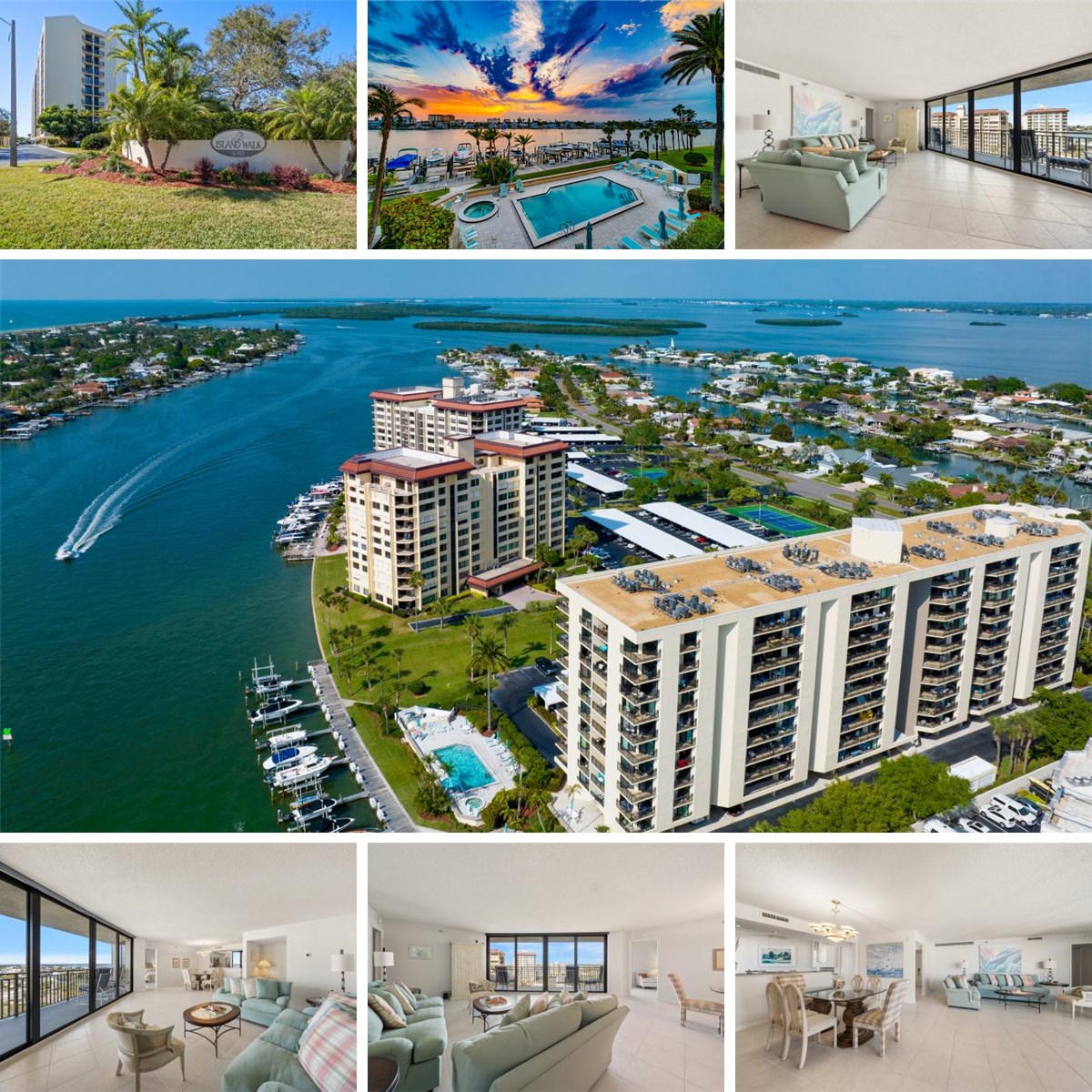 690 Island Way, unit 909, is a gorgeous, expansive, open and bright, meticulously maintained, 9th floor, corner, 2 bedroom, 2 1/2 bathroom unit in arguably the building’s best location. There are 2 balconies, both accommodating furniture, which offer exceptional water views. These views are seen within the unit from every room through newly installed, FLOOR TO CEILING HURRICANE WINDOWS. The unit is quiet with tile throughout. There is an in-unit washer/dryer, a personal storage room next to the unit, and a one-car deeded parking space under the building. This is a beautifully priced condo for sale in an HOA with ample reserves. This expansive layout is ideal for both everyday living and entertaining. It features an open living room/dining room combo and a dine-in kitchen which has stainless appliances, granite countertops, and custom built-ins, with sliding glass doors which open to a private balcony. The living room/dining room and main balcony showcase water views from the north and sunsets from the west. The primary bedroom suite is a tranquil retreat with balcony access, a generous en suite walk-in shower, granite countertops and a closet with custom built-ins. The second bedroom is equally inviting, filled with natural light, ample closet space, and balcony access. The remaining bathrooms include a hall bath with a tub/shower combination and an additional half bath, both with granite countertops. A dedicated laundry room with abundant storage and AC/heating unit is right outside the unit entry enhances everyday functionality. Residents of Island Walk enjoy resort-style amenities including a secure building entrance, waterfront heated pool and spa, tennis and pickleball courts, grilling areas, social gathering spaces, and bike storage. Ideally situated within Island Estates, a vibrant waterfront enclave offering shopping, dining, banking, a grocery store, and the Clearwater Marine Aquarium, all just minutes from the sugar-white sands of Clearwater Beach.