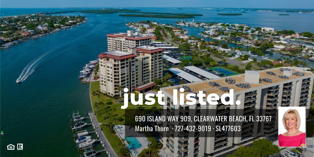 690 Island Way, unit 909, is a gorgeous, expansive, open and bright, meticulously maintained, 9th floor, corner, 2 bedroom, 2 1/2 bathroom unit in arguably the building’s best location. There are 2 balconies, both accommodating furniture, which offer exceptional water views. These views are seen within the unit from every room through newly installed, FLOOR TO CEILING HURRICANE WINDOWS. The unit is quiet with tile throughout. There is an in-unit washer/dryer, a personal storage room next to the unit, and a one-car deeded parking space under the building. This is a beautifully priced condo for sale in an HOA with ample reserves. This expansive layout is ideal for both everyday living and entertaining. It features an open living room/dining room combo and a dine-in kitchen which has stainless appliances, granite countertops, and custom built-ins, with sliding glass doors which open to a private balcony. The living room/dining room and main balcony showcase water views from the north and sunsets from the west. The primary bedroom suite is a tranquil retreat with balcony access, a generous en suite walk-in shower, granite countertops and a closet with custom built-ins. The second bedroom is equally inviting, filled with natural light, ample closet space, and balcony access. The remaining bathrooms include a hall bath with a tub/shower combination and an additional half bath, both with granite countertops. A dedicated laundry room with abundant storage and AC/heating unit is right outside the unit entry enhances everyday functionality. Residents of Island Walk enjoy resort-style amenities including a secure building entrance, waterfront heated pool and spa, tennis and pickleball courts, grilling areas, social gathering spaces, and bike storage. Ideally situated within Island Estates, a vibrant waterfront enclave offering shopping, dining, banking, a grocery store, and the Clearwater Marine Aquarium, all just minutes from the sugar-white sands of Clearwater Beach.